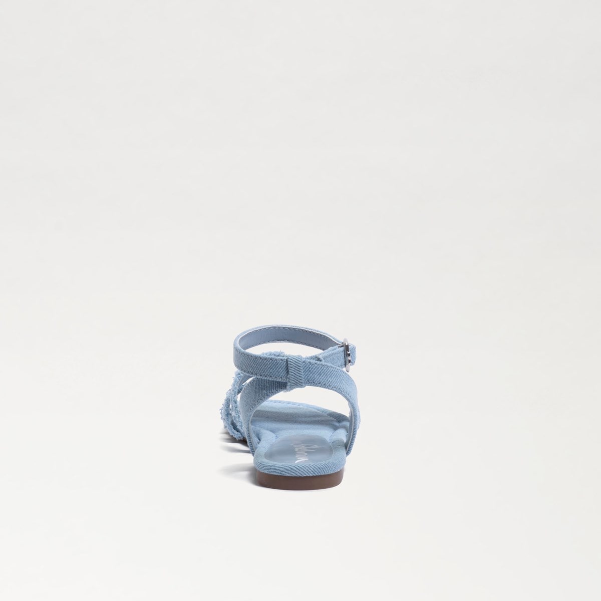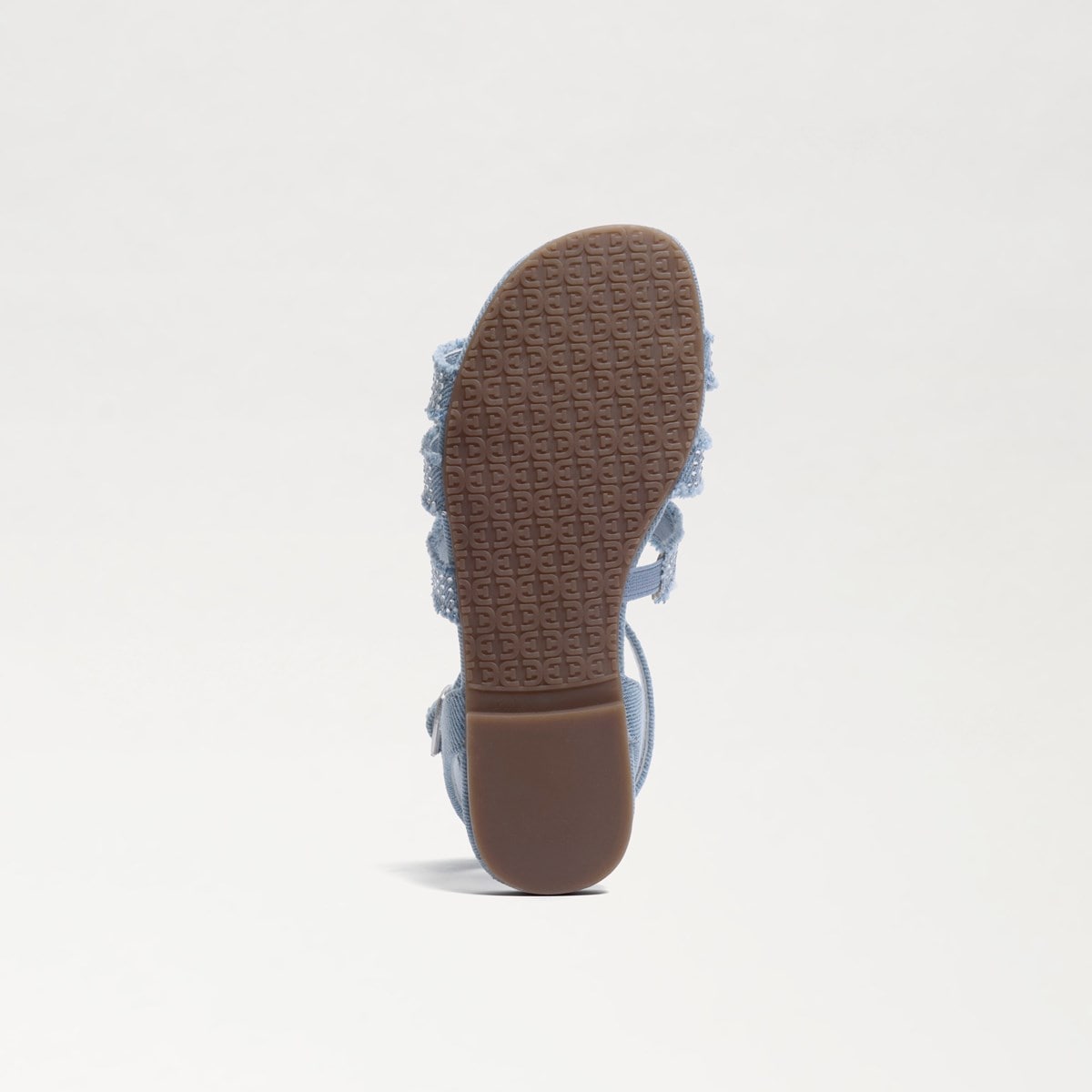 Sam Edelman denim sandal. Crystal embellishment Metallic buckle closure Heel Height: flat Material: Fabric upper Insole: PU Non-skid outsole