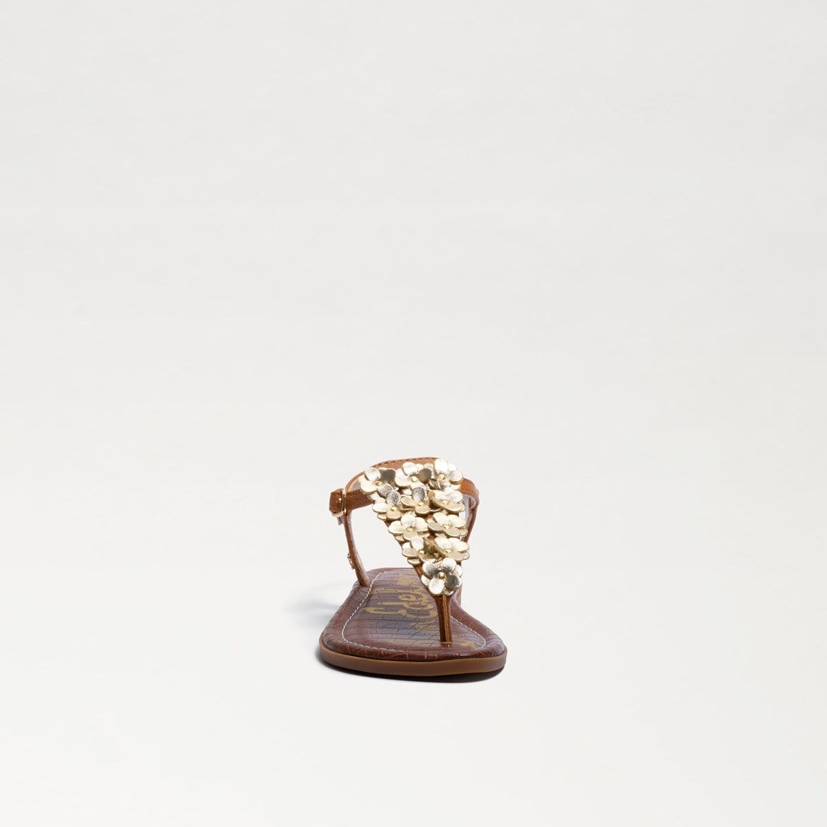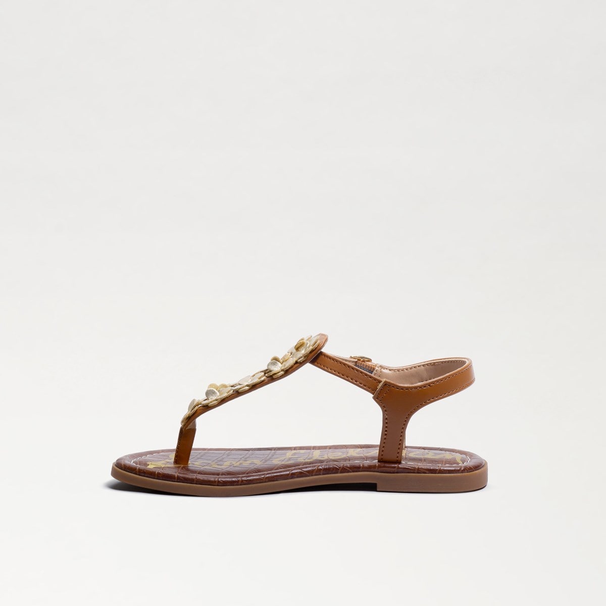 Sam Edelman thong sandal. Metallic floral appliques Metallic buckle closures Material: Metallic fabric / PU Insole: PU Outsole: non-skid