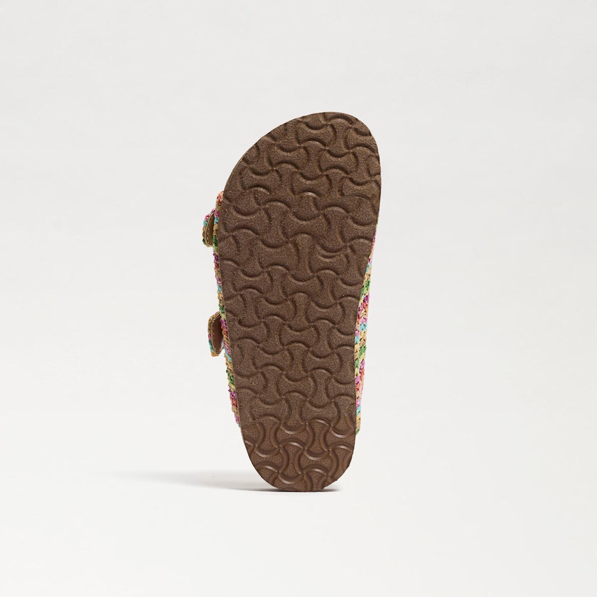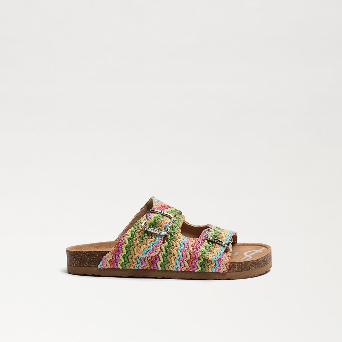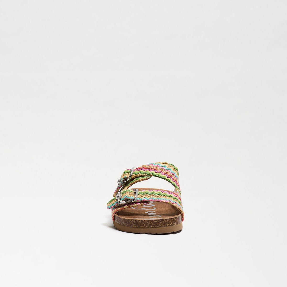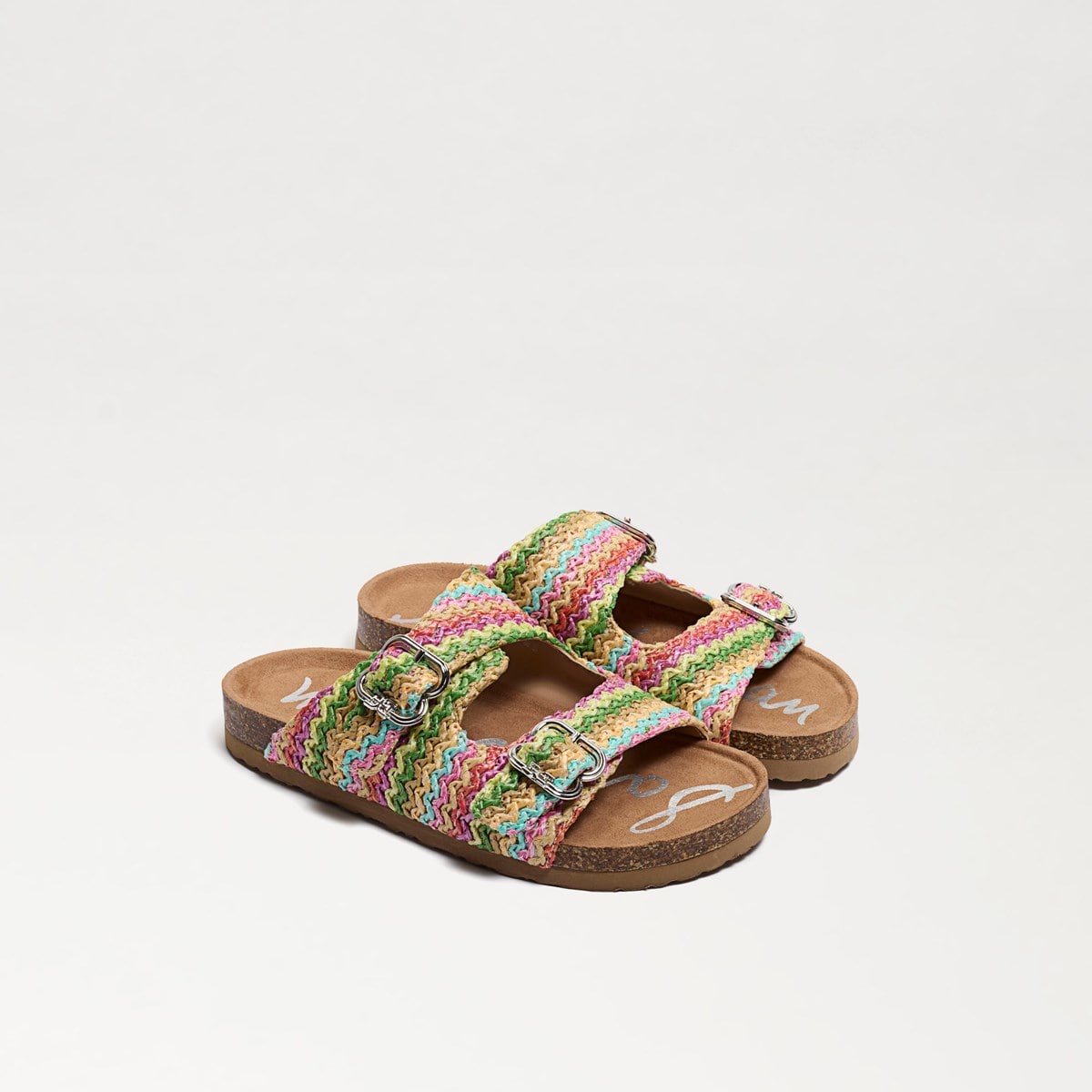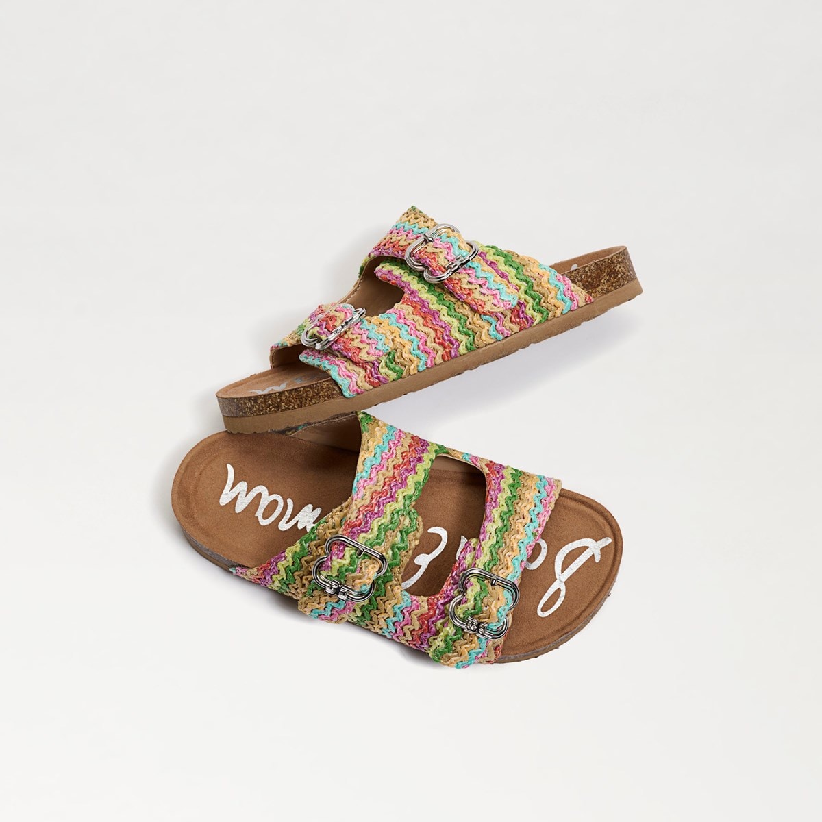 Sam Edelman youth double-strap slide-on sandal. Oversized logo metal buckles Slip on foot bed Material: Multi-colored fabric upper Insole: PU Outsole: non-skid