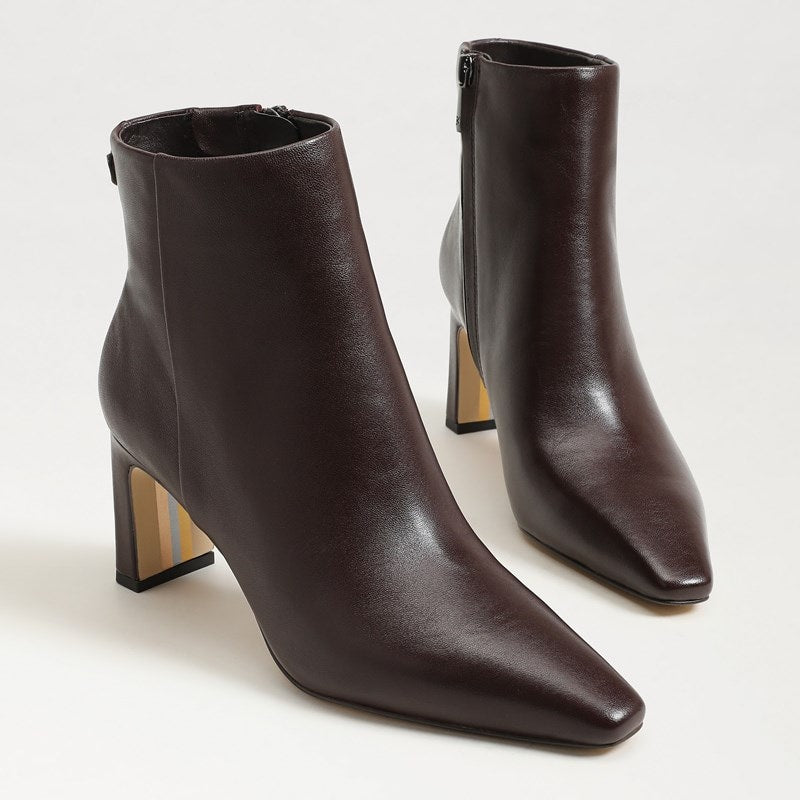 Meet the Saige heeled booties with architectural heel detail. The Saige is an amazing way to play up your favorite LBD or wrap dress. Heel Height: 6.9 CM Toe: Pointed Toe Closure: Zipper Boot Shaft: 11.9 CM Calf Circumference: 24.8 CM Material: Leather Insole: Synthetic