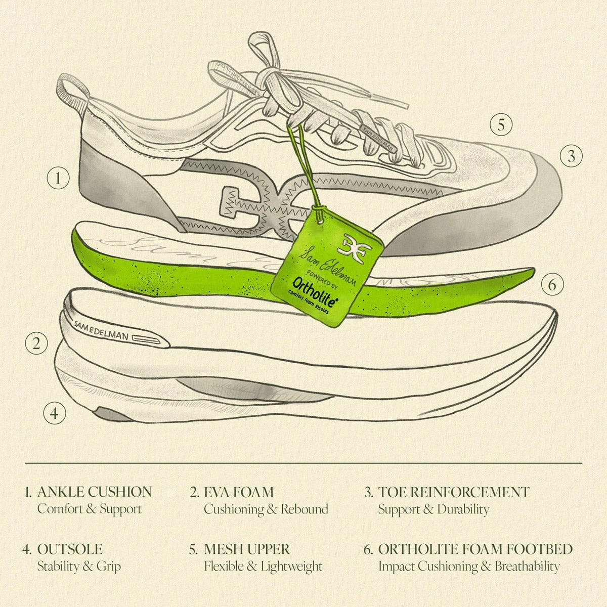Introducing Sam Edelman's first-ever performance collection. Whether you're hitting a HIIT workout, going for a light run, or stepping into your daily exercise routine, these sneakers are engineered to keep you moving with ease. Long-term cushioning: unlike traditional foam, OrthoLite® foam compresses less than 5% over the lifetime of the product so the cushioning, fit, comfort and performance virtually never change. Moisture management: The unique open-cell structure of OrthoLite® foam creates a moisture management system, helping to move moisture away and provide a cooler, drier environment in any application. Lightweight: OrthoLite® foams are extremely lightweight enhancing performance with day-in, day-out airy comfort. Washable: OrthoLite® insoles are machine washable, coming out like virtually new every time while maintaining all the comfort and performance benefits after washing. Gentle wash, air dry. Breathability: OrthoLite® foam with open-cell PU technology is breathable, allowing air to circulate around the foot, keeping the surrounding environment cooler and drier. Heel Height: 0.750 in Toe: Round Closure: Lace Up Material: Fabric, Other Insole: Fabric