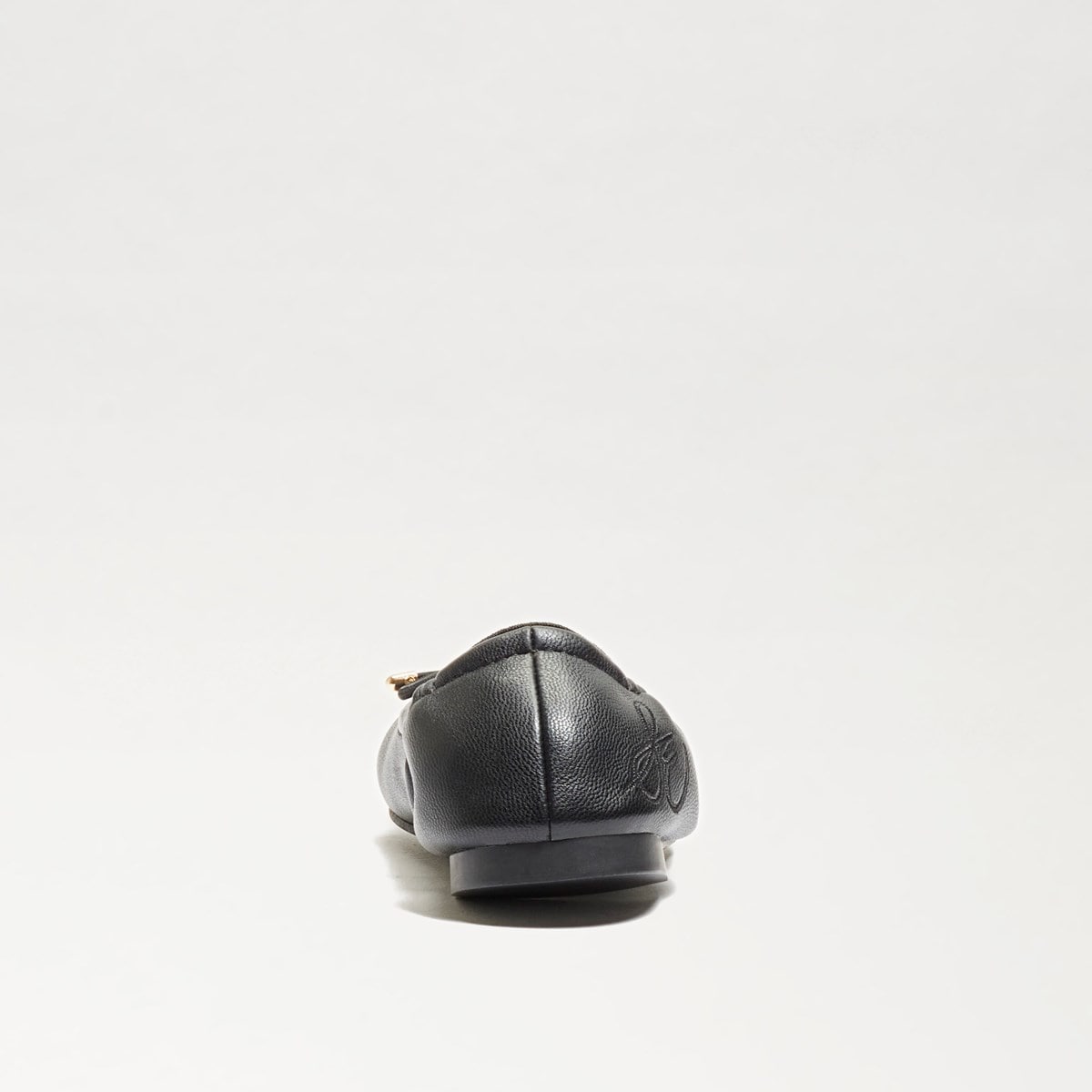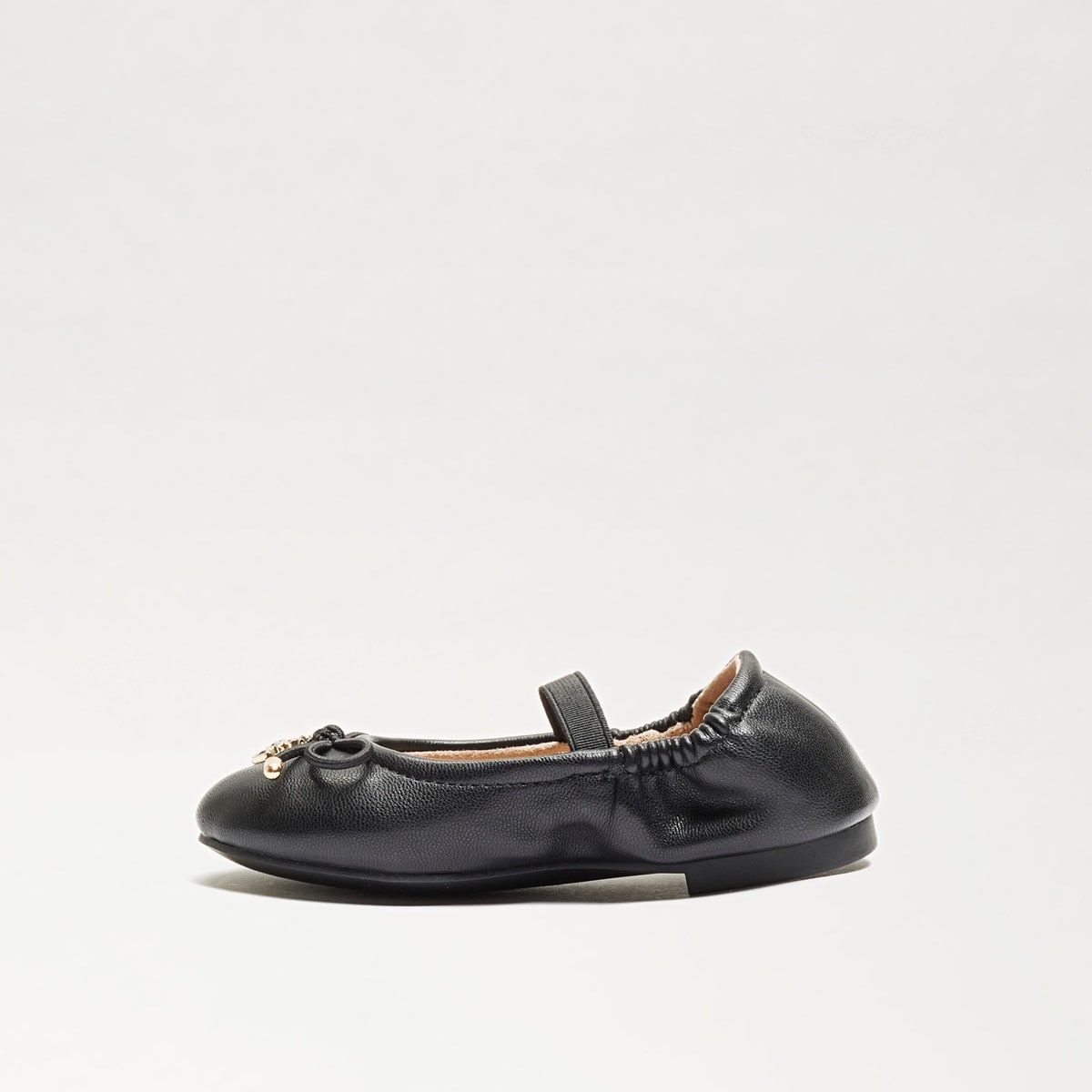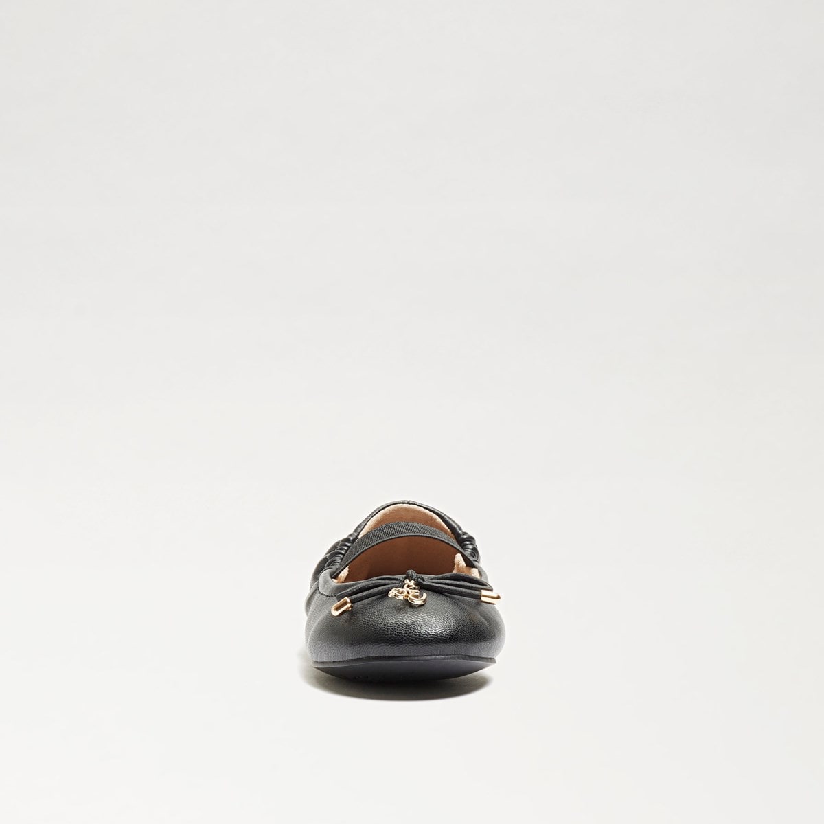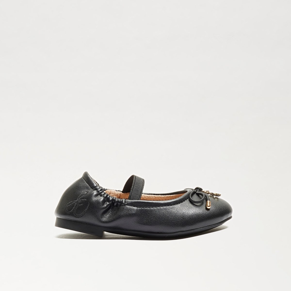 Sam Edelman metallic leather ballet flat. Decorative bow with aglets and metallic logo charm Heel Height: flat Slip on with supportive elastic strap Material: PU Insole: PU Outsole: Nonskid
